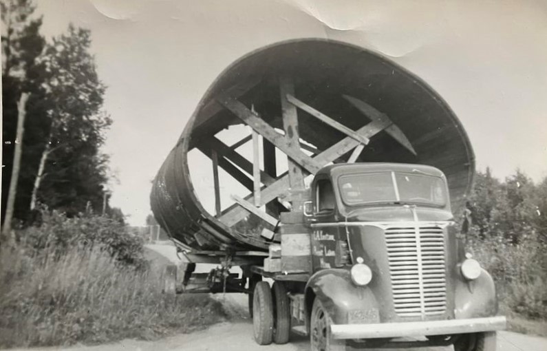 Chris Knutson, a long time resident and contractor in the Pequot Lakes Community, One piece of his various equipment was a 1940 Chevrolet Cab Over truck used in this picture to move a silo.